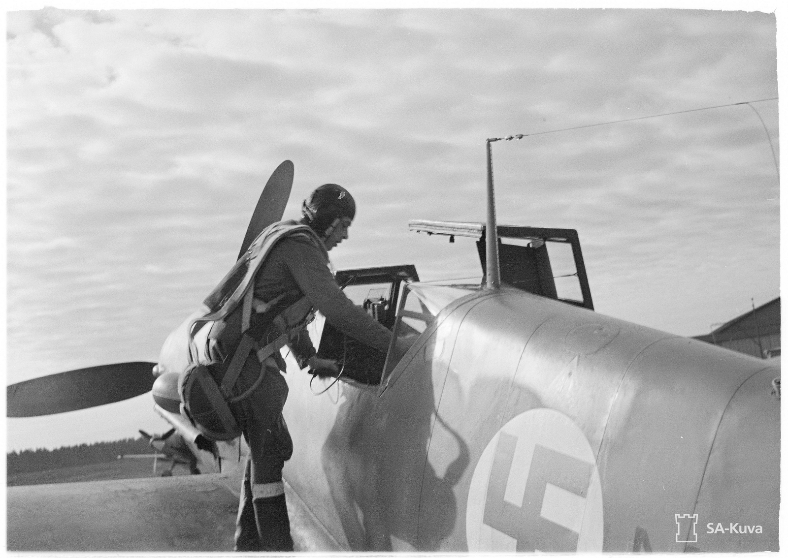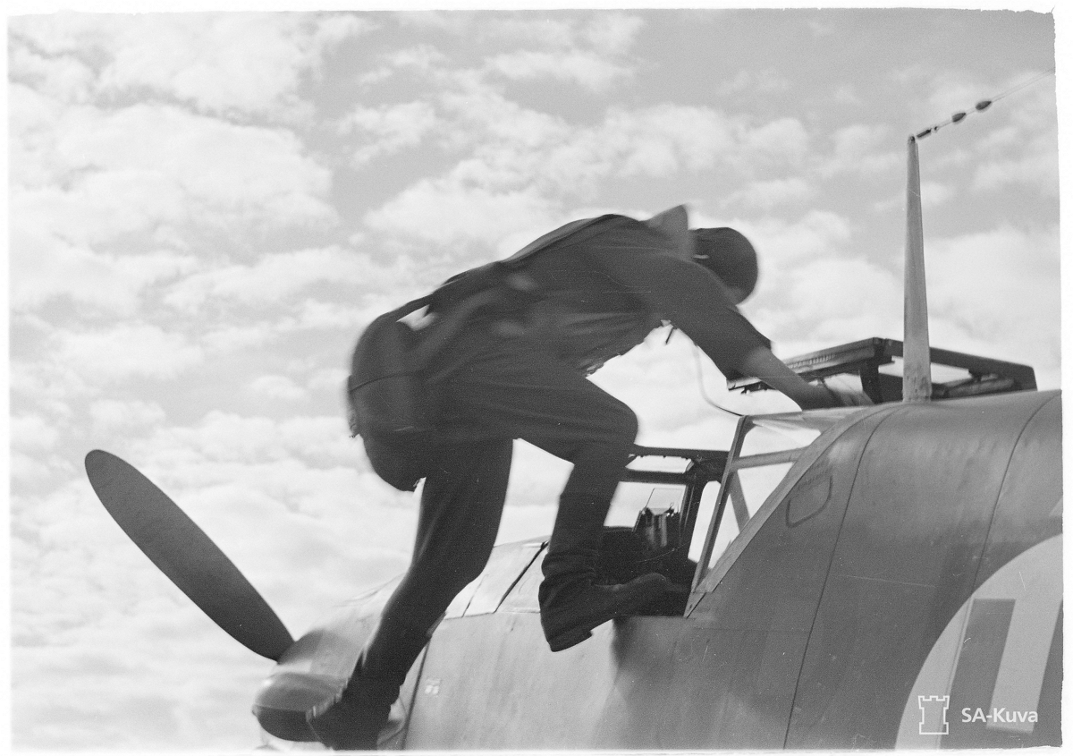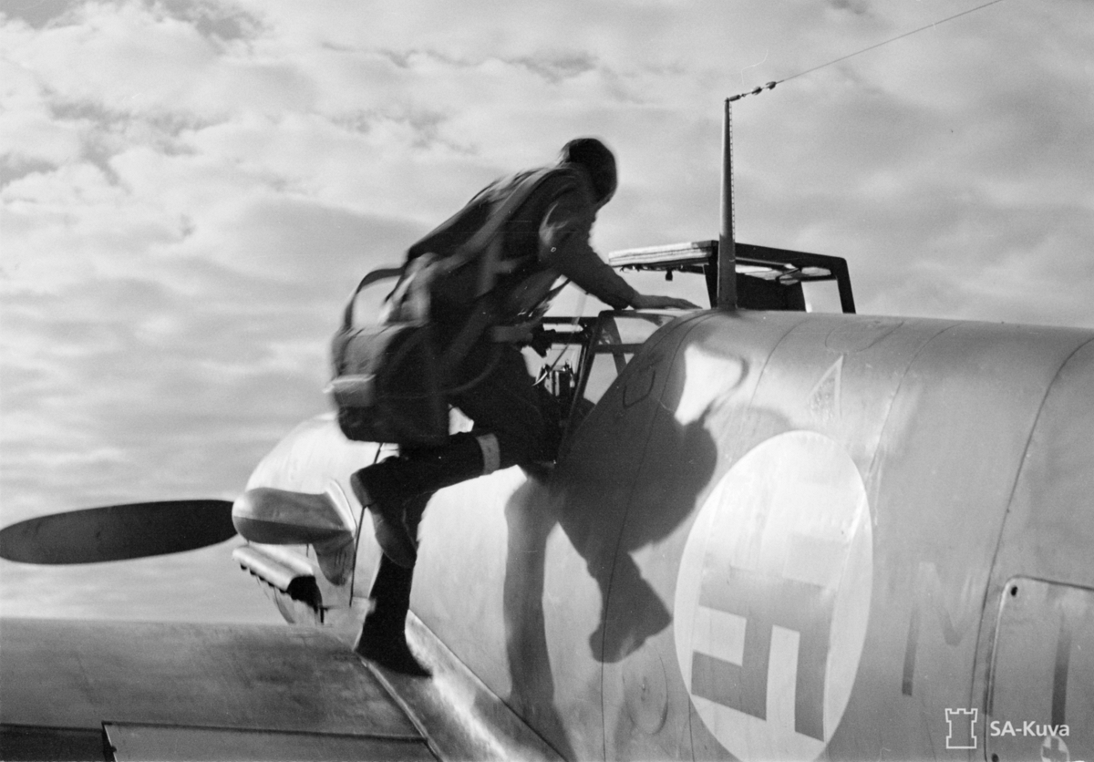1st Lieutnant [Luutnantti] Altto Kalevi 'Kale' Tervo Entering Cockpit For Alarm Start Photo From Right Side At Utti Airfield, Kouvola, Finland April 24, 1943