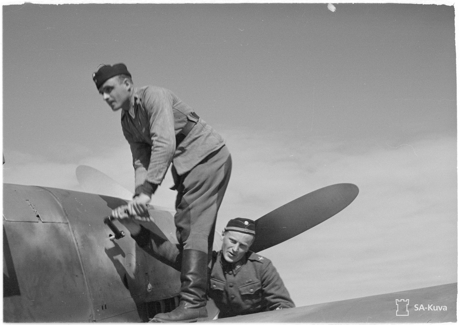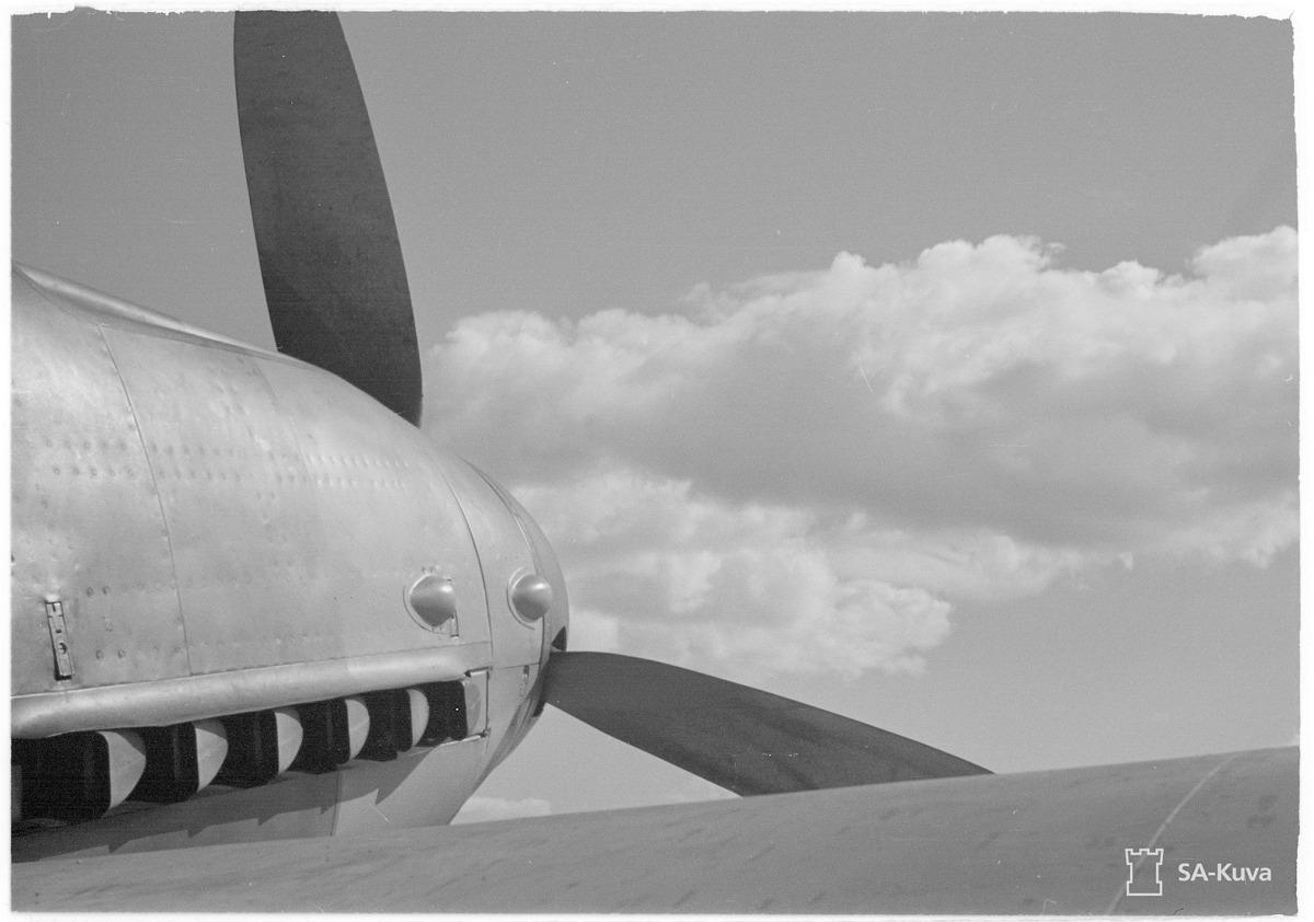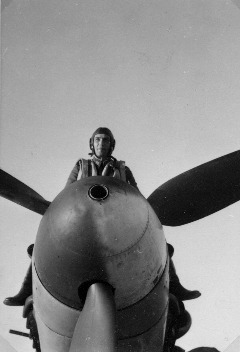 Staff Sergeant [Ylikersantti] Erik Edvard Lyly Sitting On the Nose of MT-207 Looking Down Through Propeller Blades